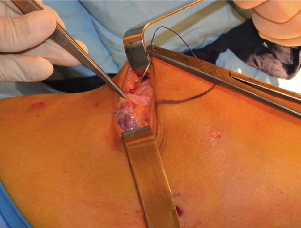 Se realiza un abordaje medial de 3 cm en el punto identificado previamente. Se coloca un arpón de 5.0 mm con doble sutura (Fig. 5). Se pasa el injerto con una Halsted larga en plano entre retináculo medial y el VMO. Se fija el injerto al arpón con rodilla en 30 grados de flexión. Es muy importante evaluar la tensión que se le da al injerto. Para evitar la hiperpresión o que el injerto quede laxo es indispensable que la rótula pueda trasladarse hacia lateral un 25% de su ancho al colocar la rodilla en extensión. Luego se introduce nuevamente el artroscopio y se comprueba que el tracking rotuliano sea correcto. Posteriormente se cierra el defecto de la toma de injerto avanzando el VMO levemente hacia lateral y distal con puntos continuos de Vicryl 1 (Figs. 6 y 7). Luego se cierra el tejido celular con vicryl 3.0 y la piel con sutura intradérmica de Vicryl rapid 4.0. Se infiltra con bupivacaína las heridas e intra-articular y se colocan apósitos estériles, venda elástica e inmovilizador de rodilla.