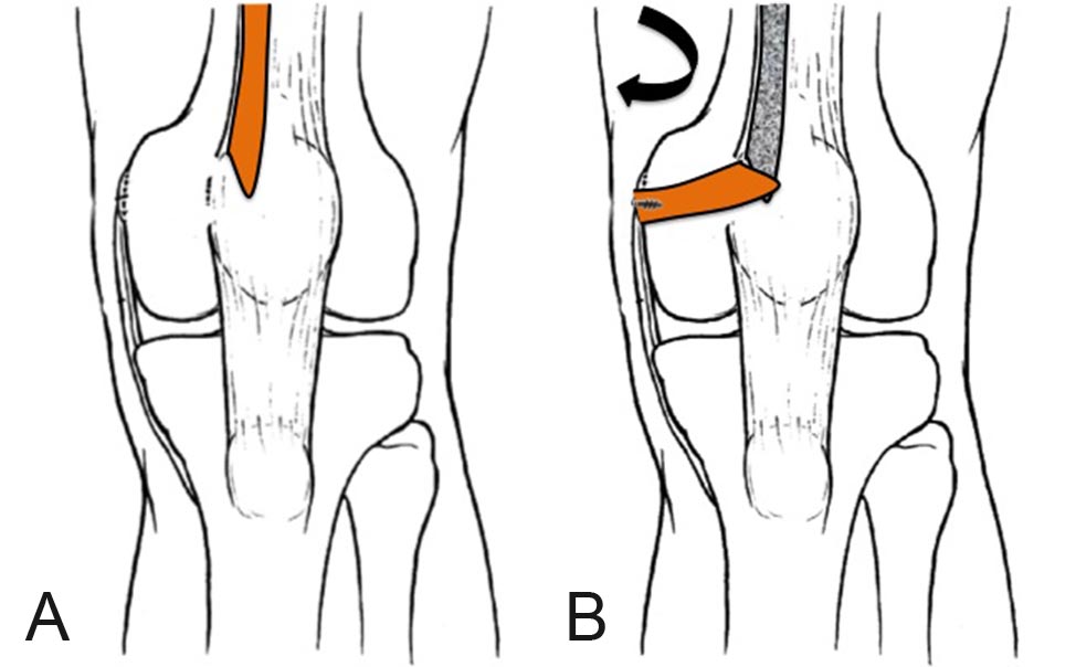 Figura 8: Diagrama de la técnica: A. Toma del injerto del tercio medial del TC, B. Fijación al punto anatómico en el fémur.