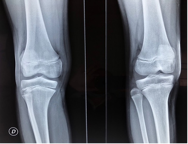 Figura 1: Radiografía oblicua interna y externa de rodilla derecha. Se puede observar cómo el peroné se encuentra lateralizado y posterior con respecto a la tibia, sugestivo de lesión de la articulación tibioperonea proximal.
