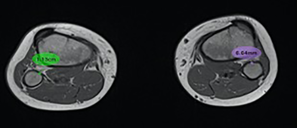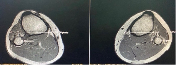 Figura 5: Resonancia magnética de control. Corte axial. Se observa igual distancia tibioperonea en ambas rodillas.