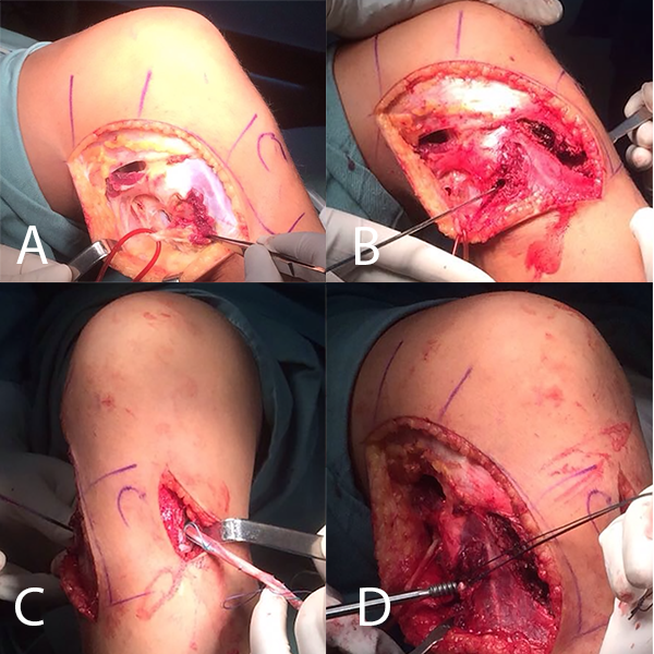 Figura 3: Fotos intraoperatorias. A) Abordaje posterolateral nervio peroneo común reparado. B) Colocación de pin para confección de túnel peroneo. C) Pasada de injerto a través del túnel tibial. D) Fijación con tonillo de interferencia túnel peroneo.
