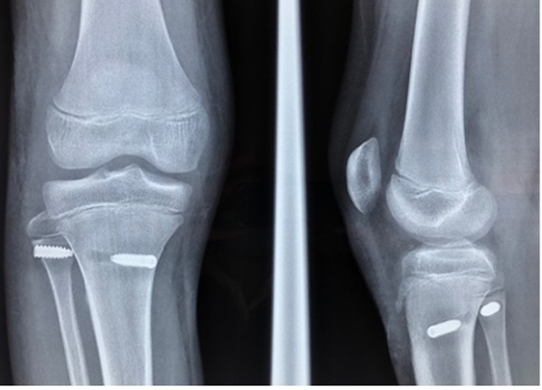 Figura 4: Postoperatorio inmediato, buena posición de los túneles. Articulación tibioperonea proximal reducida.
