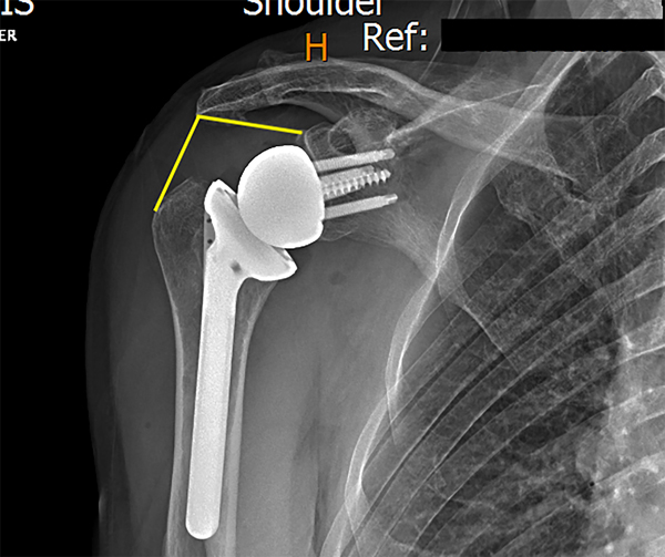 Diferentes autores han evaluado mediciones radiográficas objetivas para determinar el grado de lateralización y distalización de diferentes diseños de prótesis reversa para así estudiar su relación con los desenlaces clínicos. Boutsadis en 2018 detalló dos mediciones angulares en radiografías postoperatorias, descriptas como en ángulo de lateralización del hombro (LSA, por su nombre en inglés) y el ángulo de distalización del hombro (DSA, por su nombre en inglés).6 Estas mediciones han demostrado ser reproducibles y se correlacionan con desenlaces clínicos funcionales y arco de movimiento.