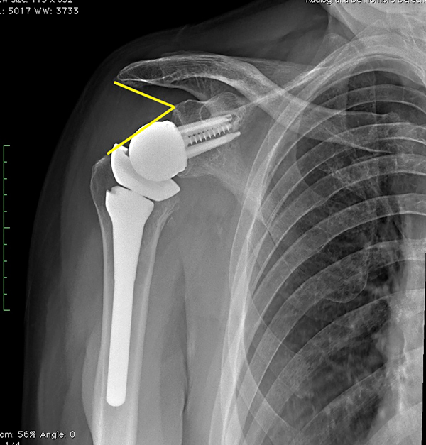 Un implante con lateralización desde la glenosfera (prótesis reversa DJO, Austin, TX, EE. UU.) provee una lateralización objetiva con un LSA de 93° y un DSA de 40°. Estos resultados se encuentran dentro del rango ideal de lateralización y distalización para la recuperación de rango de movimiento, respectivamente. Las mediciones de estos ángulos en las radiografías postoperatorias son reproducibles entre diferentes observadores.