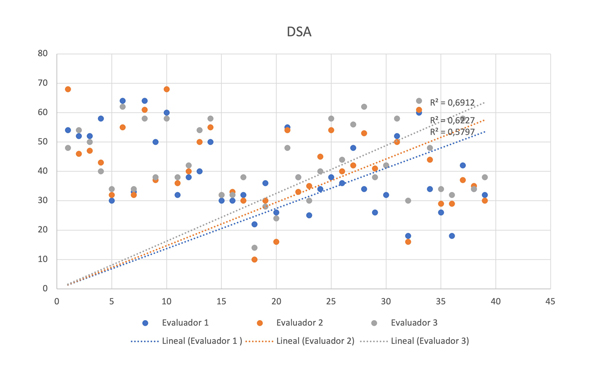 Figura 4: Valores de ángulo de distalización, evaluación de la concordancia entre los tres evaluadores (n = 39).