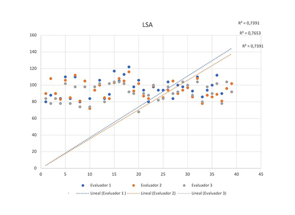 Figura 3: Valores de ángulo de lateralización, evaluación de la concordancia entre los tres evaluadores (n = 39).