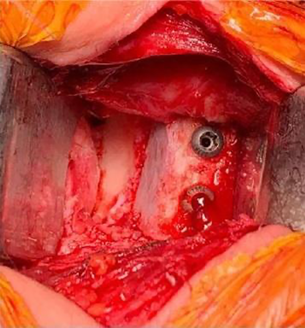 Se realizó un abordaje deltopectoral sobre la incisión de la cirugía previa. Se accedió a la articulación a través de una incisión horizontal sobre el subescapular en la unión entre el tercio superior y los dos tercios inferiores. Luego se accedió a la cara anterior de la glena. Posteriormente, se efectuó la resección del injerto coracoideo y los tornillos de la cirugía previa. Utilizando la sierra recta, se preparó la superficie anterior de la glena para lograr un lecho sangrante de hueso esponjoso donde posicionar el injerto de cresta, y así favorecer la consolidación ósea entre el injerto y la glena. Luego, con la ayuda de guías específicas, se fijó transitoriamente el injerto de cresta en la cara anterior de la glena con dos clavijas asegurando que este quede exactamente alineado con el cartílago glenoideo, y se hizo la fijación definitiva del injerto con dos tornillos canulados de esponjosa de espira parcial, de 30 a 32 mm, según la magnitud del injerto y el tamaño del paciente (fig. 2). Por último, se realizó un lavado articular, hemostasia y el cierre de herida por planos.