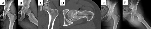 Figura 1: A-B) Radiografía preoperatoria de cadera izquierda, proyección anteroposterior y lateral, respectivamente. C-D) Tomografía axial computada, con ángulo de Wiberg de 23º y alfa de 51º. E-F) Proyecciones anteroposterior y lateral postoperatorias.