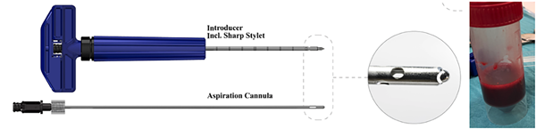 El procedimiento se inicia mediante la aspiración de la médula ósea de la cresta ilíaca ipsilateral utilizando un trocar afilado con una manga de aspiración hueca. La aguja introductora con un estilete afilado se coloca en el hueso esponjoso entre las corticales. Luego de aspirar 1 ml de médula ósea, para asegurar el posicionamiento adecuado de la punta de la aguja, se reemplaza un estilete afilado por uno romo. A partir de un solo orificio, Marrow Cellution™ es capaz de recolectar hasta 10 ml de aspirado de médula ósea de alta calidad (BMA) (Marrow Cellution™, Aspire Medical Innovation, Alemania) equivalente o superior a otros sistemas que requieren pasos de manipulación adicionales fuera del campo estéril, como la centrifugación (BMAC) o la separación química en un laboratorio. Además, se utiliza un trocar afilado para cosechar algunas clavijas o tacos de hueso de cresta ilíaca (figs. 4 y 5).11