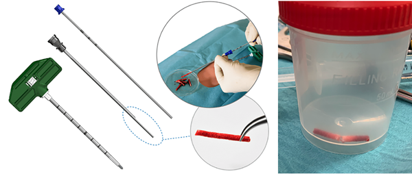 Figura 5: Osteocoreplastia. Instrumental quirúrgico. Aguja trefina de 8G. Dispositivo de extracción de las clavijas o tacos óseos de cresta iliaca y sonda de medición.