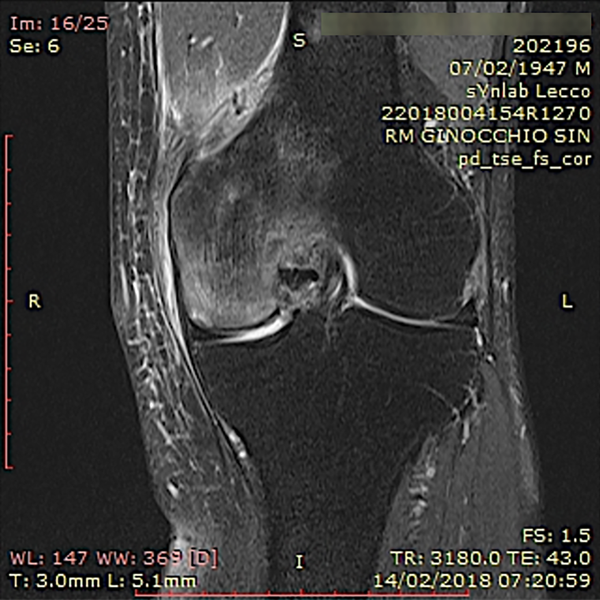 Figura 10: Un ejemplo de caso de lesión del hueso subcondral en el cóndilo femoral medial de la rodilla tratada con osteocoreplastia. Doce meses después del tratamiento, vista coronal de la resonancia magnética de la rodilla.