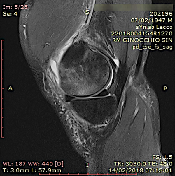 Figura 8: Un ejemplo de caso de lesión del hueso subcondral en el cóndilo femoral medial de la rodilla tratada con osteocoreplastia. Pretratamiento, vista sagital de la resonancia magnética de la rodilla.