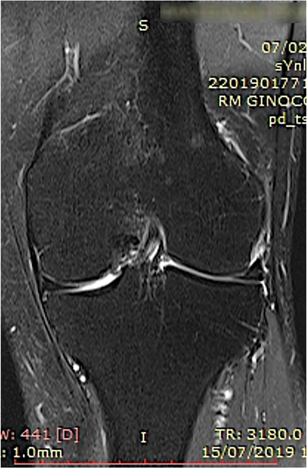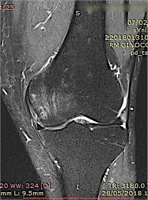 Figura 9: Un ejemplo de caso de lesión del hueso subcondral en el cóndilo femoral medial de la rodilla tratada con osteocoreplastia. Dos meses después del tratamiento, vista coronal de la resonancia magnética de la rodilla.
