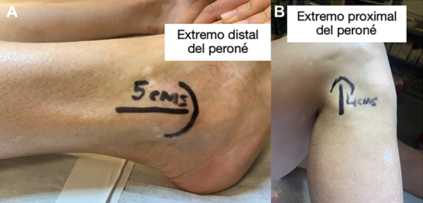 Figura 1: A) Imagen intraoperatoria con marcación de puntos anatómicos e incisión quirúrgica en el tobillo ipsilateral. B) Marcación en el extremo proximal del peroné a 4 cm de este.