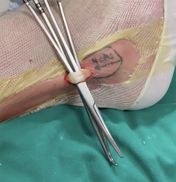 Figura 5: Extracción del tendón peroneo lateral largo con stripper cerrado. Se deben mantener dos dedos en la zona demarcada previamente en el peroné proximal para evitar el daño de estructuras nerviosas.