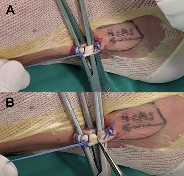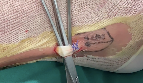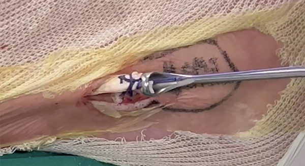 Luego de limpiar el tendón, se realiza la medición del largo para posteriormente plegarlo de manera longitudinal por el medio de este, suturando el cabo proximal con hilo Ethibond N.º 2®.