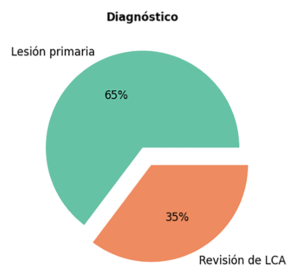 Entre el 20 de julio de 2023 y el 20 de julio de 2024 se realizaron veintinueve reconstrucciones del ligamento cruzado anterior utilizando el PLL como injerto de elección. De ellos, diecisiete cumplieron con el criterio de inclusión (seguimiento mayor a tres meses) para la evaluación de la morbilidad del sitio dador. Seis casos fueron revisiones de plástica de LCA asociadas a otros procedimientos (tres cirugías de revisión de plástica primaria asociada a osteotomía de tibia y tres revisiones con tenodesis lateral de Lemaire asociada), mientras que en once casos fueron el injerto de elección para la plástica primaria del ligamento cruzado anterior (Tabla 1) (fig. 6). Catorce pacientes eran de sexo masculino y tres, de sexo femenino. La edad promedio fue de 33 años ± 11.06 (rango 18 - 54 años) (fig. 7). El largo promedio del tendón PLL fue de 269 mm ± 2.92 mm y el diámetro promedio obtenido fue de 8.62 mm ± 0.6 mm en todos los casos. Si tomamos solamente a los pacientes de sexo masculino, el diámetro del injerto doble fue de 8.28 mm ± 0.26 mm, y en el caso de los de sexo femenino el diámetro fue de 7.25 mm ± 0.15 mm (fig. 8). Un solo caso presentó infección superficial de la herida que fue tratado con antibiótico (cefalexina 1 g) resuelta luego del tratamiento. Ninguno de los pacientes presentó déficit neurológico postquirúrgico.