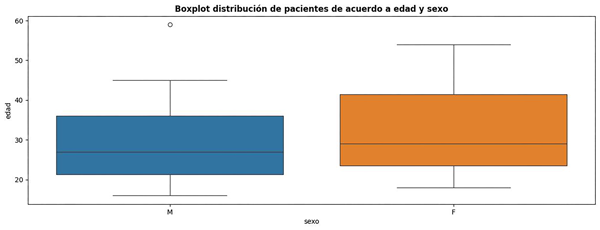 Figura 7: Boxplot de distribución de edad de acuerdo al sexo de los pacientes. Total: diecisiete pacientes, catorce de sexo masculino y tres, femenino (z_stat: 4.535, valor p: 0.005). Edad promedio: 33 años ± 11.06 (rango 18 - 54 años).