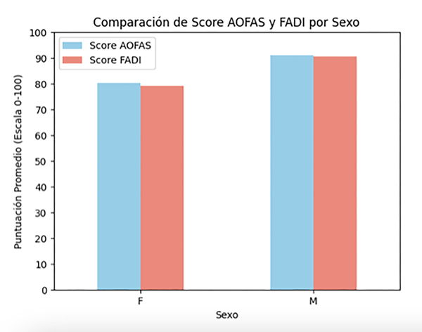 Figura 9: Resultado de la evaluación con score AOFAS y FADI de acuerdo al sexo de los pacientes.