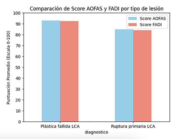 En nuestra serie de casos evaluados a los tres meses postquirúrgico, el score AOFAS promedio para los pacientes fue de 92.25 ± 5.18 (rango 89 - 100), y el score de FADI a tres meses fue de 94.37 ± 4.18. No existieron diferencias significativas cuando comparamos los resultados entre pacientes sometidos a revisión de ligamento cruzado anterior con aquellos a los que se realizó una plástica primaria. Tampoco existieron diferencias significativas cuando dividimos ambos grupos de acuerdo al sexo en cuanto al score obtenido (figs. 9 y 10).