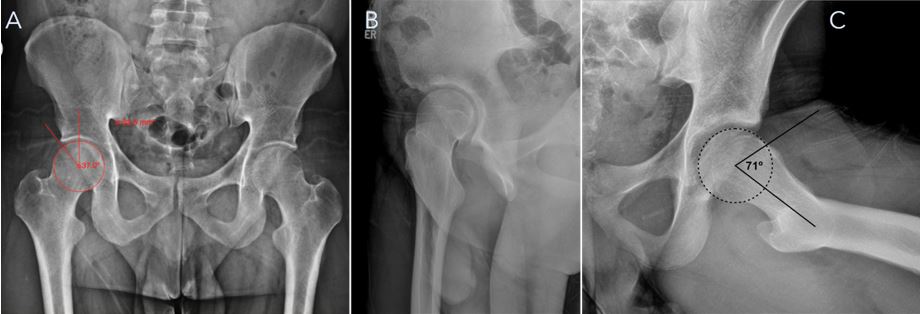 Figura 4. A) Proyección anteroposterior de pelvis con la medición del ángulo lateral centro-borde o de Wiberg, con valores normales entre 25 y 40°. B) Proyección de falso perfil, útil para evaluar lesiones en la parte anterior del acetábulo. C) Proyección de Dunn, en la que se observa el ángulo alfa para detectar lesiones tipo Cam en la unión cuello-cabeza del fémur. Se considera patológico un ángulo superior a 55°