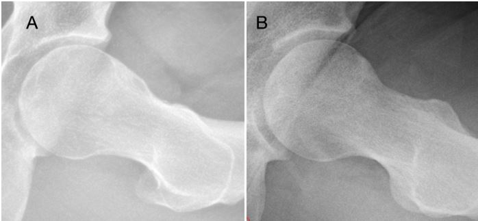 Figura 8. Radiografías. A) Prequirúrgica. B) Postquirúrgica tras femoroplastia artroscópica