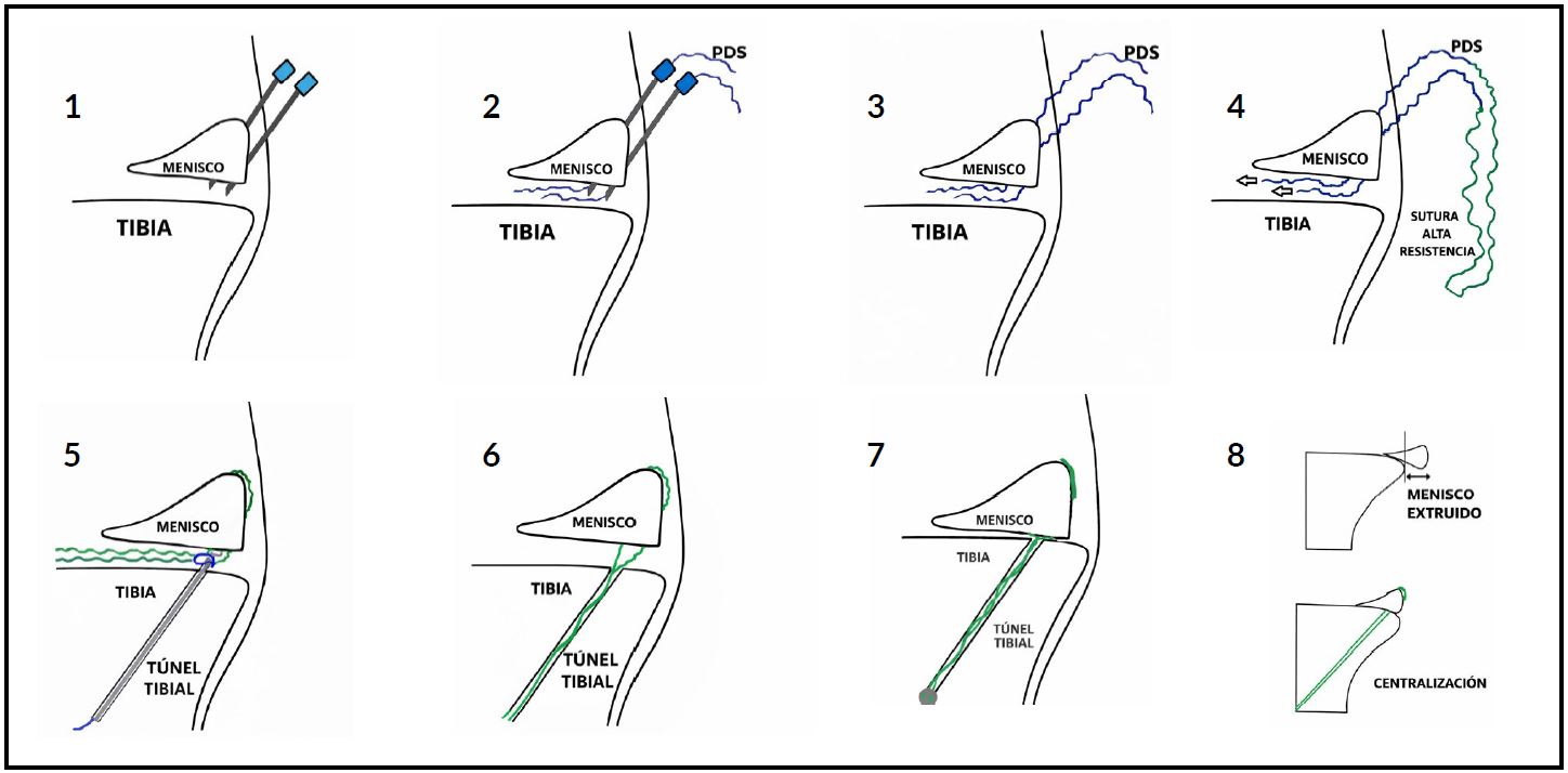 Para abordar este problema, se han desarrollado diferentes técnicas de centralización meniscal. Estudios han demostrado que la centralización puede reducir de manera significativa las presiones de contacto en el compartimento medial y restaurar la función condroprotectora del menisco.3 Descripciones recientes incluyen el uso de túneles tibiales adicionales combinados con suturas de menisco,5 anclajes sobre el ligamento meniscotibial6 y técnicas con implantes todo-adentro.8 Aunque eficaces, estos métodos suelen requerir instrumental específico, múltiples implantes o presentan un costo elevado, lo que limita su aplicación en algunos contextos.8
