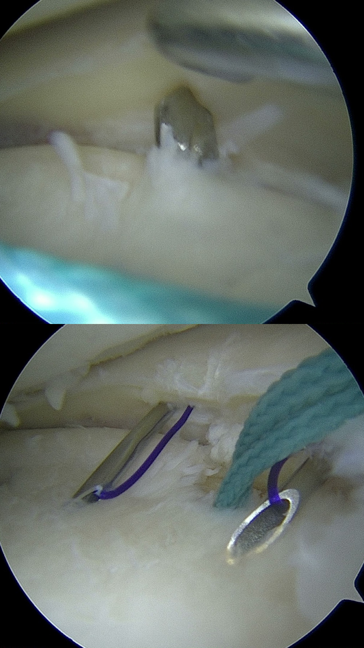 Luego se continúa con la creación de portales artroscópicos estándar anterolateral (visualización) y anteromedial (trabajo). Con un artroscopio de 30° se realiza artroscopia diagnóstica sistemática, mediante la que se confirma la presencia de una rotura radial de raíz meniscal posterior con extrusión. Los bordes lesionados del menisco se debridan cuidadosamente y se prepara la huella de la raíz en el platillo tibial. De verse necesario, se puede realizar un pie-crust del ligamento colateral medial para mejorar la visualización y movimiento en el compartimento medial. A continuación, se confeccionan dos túneles tibiales utilizando la guía tibial del LCA (preferentemente pediátrica de perfil bajo) o bien la guía específica para raíz meniscal (Tabla 1).