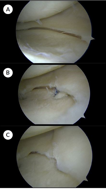 Figura 3. A) Menisco extruido. B) Paso de suturas por túnel tibial. C) Menisco centralizado.