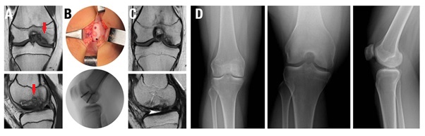 Figura 2. Fijación híbrida en una paciente de 14 años con osteocondritis disecante juvenil localizada en el cóndilo femoral medial. A) RNM DPFS sagital y coronal que demuestra lesión inestable de gran tamaño (flecha roja). B) Imagen intraoperatoria durante la colocación de un injerto osteocondral de 8 mm y 2 tornillos canulados. C) RNM a los 6 meses de evolución, luego del retiro del material de osteosíntesis, se evidencia la curación de la lesión y la incorporación del injerto. D) Radiografías de frente, túnel y perfil donde se observa la resolución completa de la lesión.