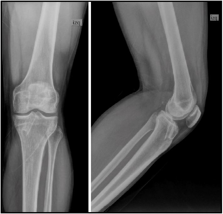 Al primer mes del postoperatorio, se realizaron radiografías de frente y de perfil de la rodilla para evaluación de la orientación de los túneles y posición de los elementos de fijación (Fig. 3).