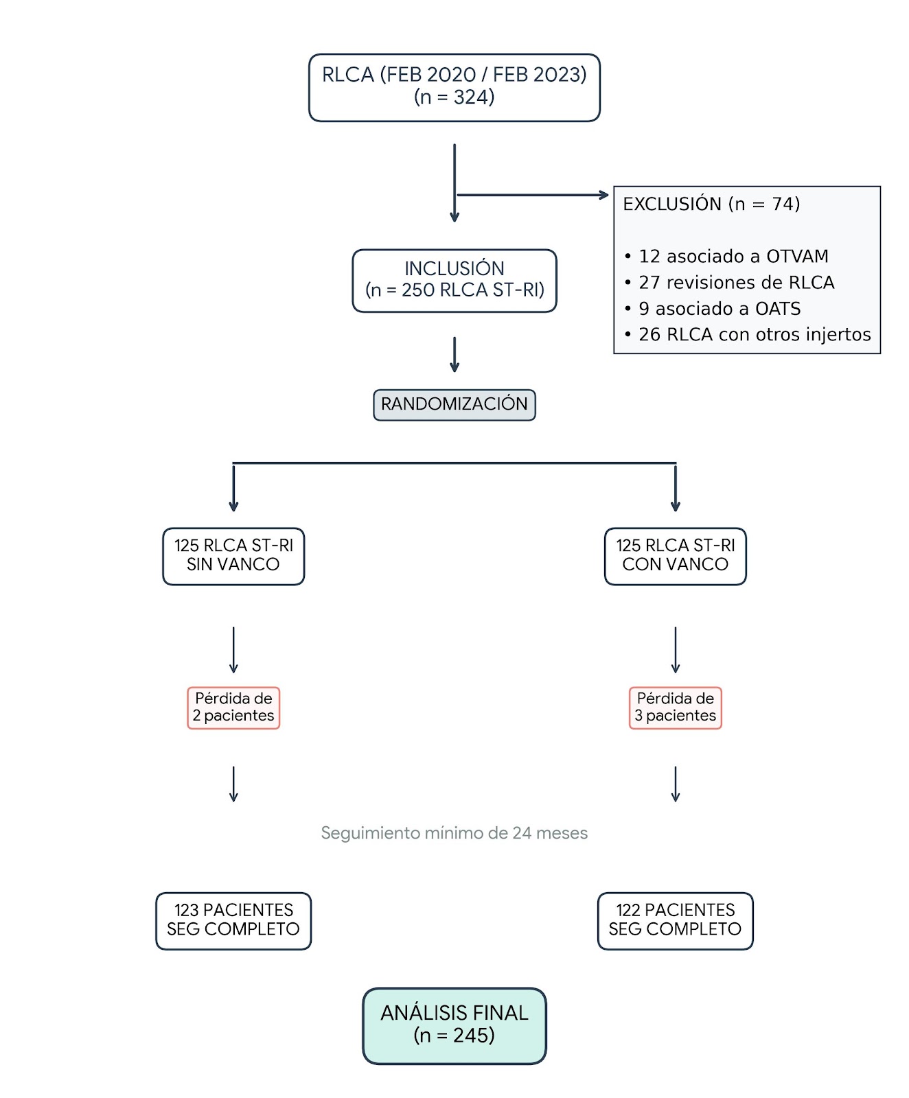Entre febrero de 2020 y febrero de 2023 se realizaron 324 RLCA, se excluyeron 12 pacientes a quienes se les adicionó una osteotomía tibial valguizante de apertura medial (OTVAM), 27 en quienes se realizó una revisión de RLCA, 9 a los que se les efectuó transporte osteocondral y 26 casos en los cuales se utilizaron injertos distintos a ST-RI. De esta manera, se reclutaron 250 pacientes, quienes fueron operados de una RLCA con injertos ST-RI cuádruples, sin otro procedimiento asociado. Fueron aleatorizados en 2 grupos: uno conformado por 125 pacientes en quienes se utilizó 1 g de vancomicina (grupo de intervención) disuelta en 200 cc de solución fisiológica y, el otro conformado por 125 pacientes en quienes el injerto STRI fue sumergido en 200 cc de solución fisiológica sin vancomicina (grupo control). Tres pacientes del grupo de intervención (vancomicina) no cumplieron con el seguimiento adecuado, 2 de ellos porque no se pudo consignar seguimiento en tiempo y forma y el otro porque se mudó a otro país. En el grupo de control (sin vancomicina), 2 pacientes no completaron con el seguimiento adecuado (ambos por quedar sin cobertura de salud). Así, el grupo de intervención ST-RI con vancomicina quedó conformado por 122 pacientes y el grupo de control ST-RI sin vancomicina, integrado por 123 pacientes. De esta manera, el número total de la muestra que cumplió con el seguimiento mínimo de 24 meses fue de 245 (Fig. 5).