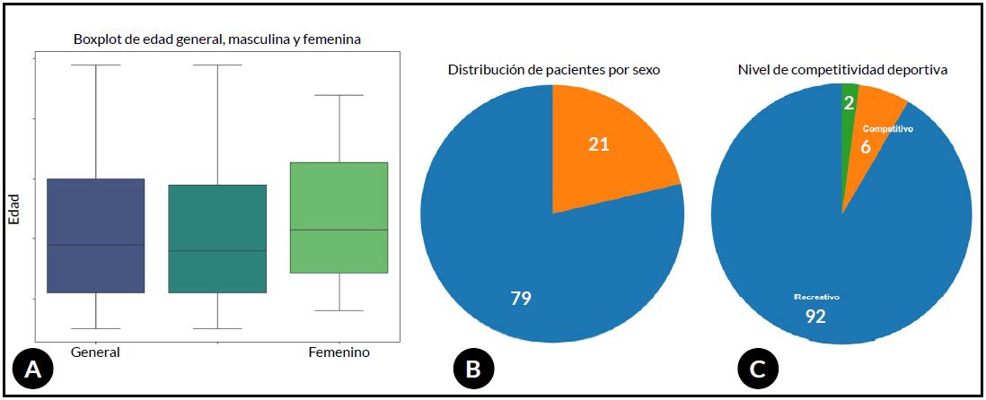 Figura 1. Distribución demográfica de la cohorte evaluada. A) Boxplot de edad de los pacientes incluidos en el estudio (mediana: 29 años; rango intercuartílico: 15-59 años). B) Distribución por sexo, con predominio masculino 79 % hombres vs. 21 % mujeres. (χ² = 34.77; p <0.001). C) Nivel de actividad deportiva de los pacientes, con claro predominio de deportistas amateur (92 %), seguido por deportistas competitivos (6 %) y pacientes sin actividad deportiva (2 %). Esta distribución difirió significativamente de una distribución uniforme entre categorías (χ² = 129.93; p <0.001).