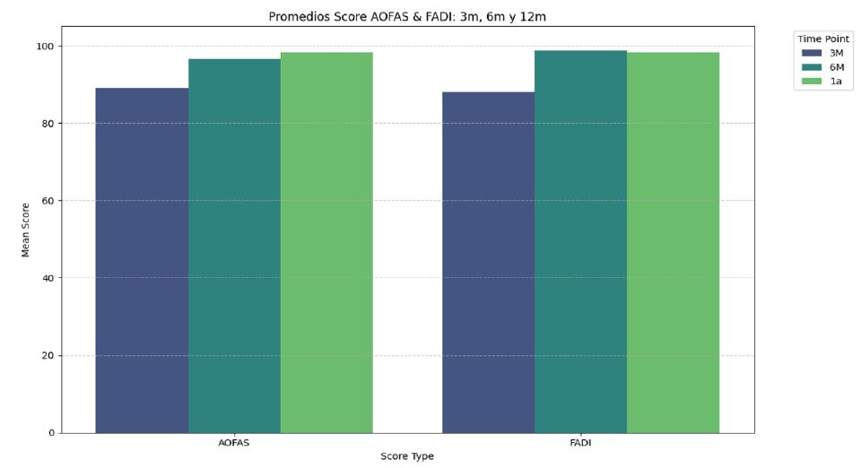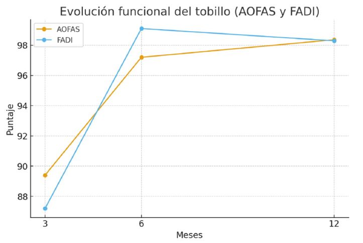 Figura 4. Progresión de los puntajes AOFAS y FADI a los 3, 6 y12 meses. La mayor mejoría se observa entre los 3 y 6 meses, con estabilización de los valores hacia el primer año postoperatorio.