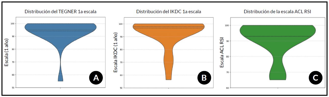 Figura 6. Distribución de los puntajes funcionales y psicológicos de rodilla a 12 meses de seguimiento. A) Escala de Tegner, presentó una media de 94.05 ± 10.41, con un rango entre 55 y 100. B) Score de IKDC con una media de 92.76 ± 12.12, con valores que oscilaron entre 56.3 y 100. En ambas escalas funcionales, los valores de cuartiles evidenciaron una marcada tendencia hacia resultados funcionales altos en la mayoría de los pacientes. C) Distribución del puntaje ACL-RSI a 1 año postoperatorio, representando la dimensión psicológica del retorno al deporte. Se muestran los valores mínimos, máximos, la media, la desviación estándar y los cuartiles correspondientes en la cohorte evaluada.