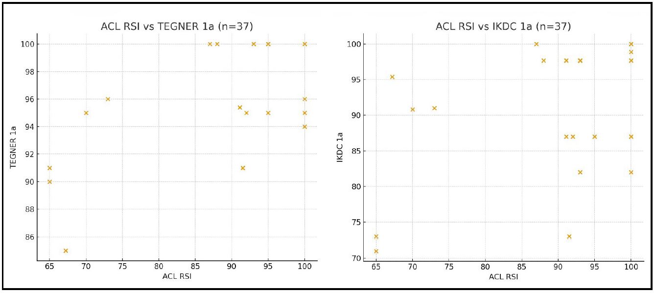 Figura 7. Asociación entre disposición psicológica para el retorno deportivo (ACL – RSI) y la función de la rodilla al año, evaluado mediante las escalas de Tegner (izquierda) y el score de IKDC (derecha). Las cruces corresponden a los resultados individuales de los pacientes.