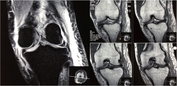 Figura 1: RM de rodilla izquierda. Secuencia T2 y T1 en cortes coronales. Se observa lesión completa del ligamento colateral interno con compromiso de componente menisco femoral (hoja profunda) al momento del trauma.