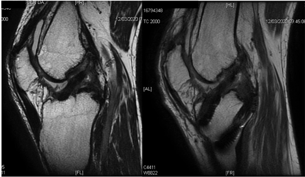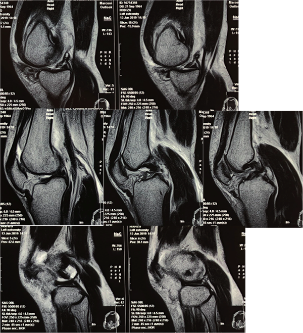Figura 2: RM cortes sagitales secuencia T1. Se observa la traslación posterior de la tibia. Tendón rotuliano laxo como signo de inestabilidad posterior. Lesión grado III del cuerno posterior del menisco interno, trazo oblicuo asociado a luxación de la tibia. Lesión completa de ambos ligamentos cruzados (LCA – LCP). Menisco externo sin lesión objetiva.