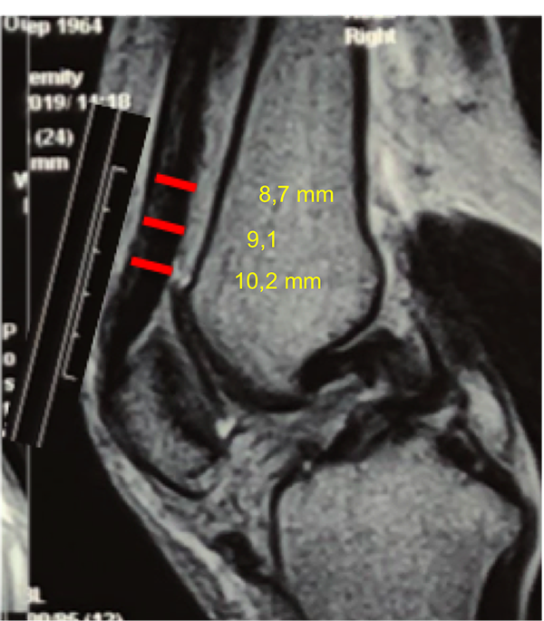 A los tres meses del accidente, una vez rehabilitadas las fracturas expuestas en mano y pie izquierdo, la rodilla presentó un examen físico compatible con secuela de lesión inestable de ligamento colateral interno con bostezo grado II (++/+++) con tope laxo en 30° de flexión y en extensión completa. No presentó derrame articular. Se observó desplazamiento posterior de tibia estructurado. Cajón posterior grado III (sin tope neto) y Godfrey positivo. Lachman positivo con pivot shift positivo. Rango de movilidad completo sin bloqueo. Dolor en compartimiento interno tercio posterior. El score de Lysholm Tegner preoperatorio de 10 y 1 respectivamente. El estudio por resonancia magnética (RM) confirmó el diagnóstico (figs. 1 y 2). El espesor medido del tendón cuadricipital a 30, 40 y 50 mm de inserción proximal en rótula por este estudio en cortes sagitales fue de 10.2 – 9.1 – 8.7 mm, respectivamente (fig. 3).