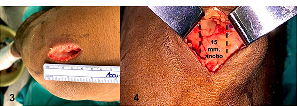 Se identificó el tendón cuadricipital. Se contaba con un ancho tendinoso que superaba los 2 cm a nivel inserción en rótula. Se tomaron 15 mm de ancho a nivel tendinoso suprarrotuliano con regla y se talló el injerto por misma ventana cutánea (fig. 4 B).