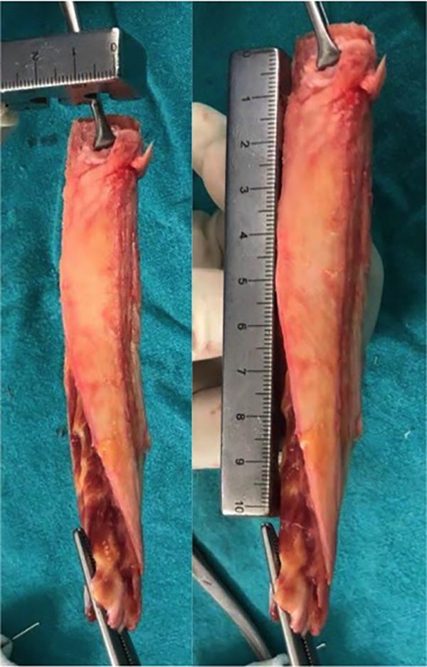 Obtuvimos dos injertos DTC de 7 mm de ancho y un espesor mayor sobre la región distal de los injertos (13 mm) afinándose a proximal, como se describe en trabajos anatómicos (9 mm).