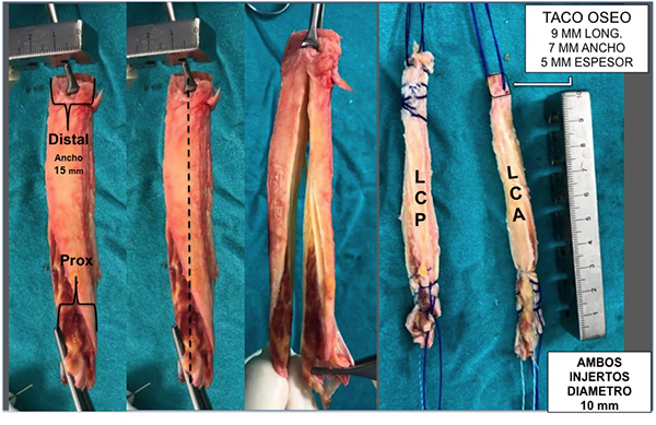 El diámetro de ambos tendones preparados fue de 10 mm. Uno de los injertos presentaba una mayor extensión debido a que poseía taco óseo. Este se utilizó en la reconstrucción del LCP, debido al mayor recorrido que requería la técnica empleada (ver fig. 6).