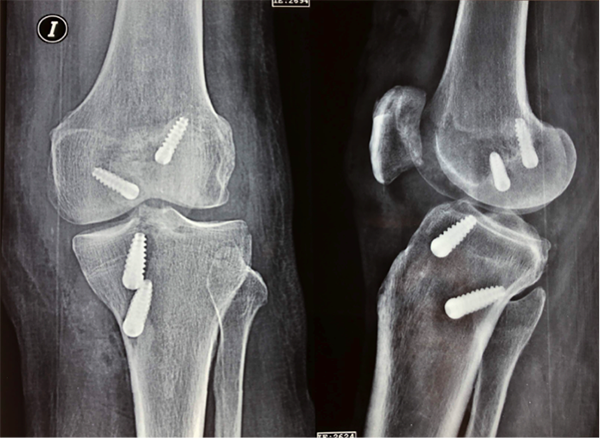 Figura 8: Rx frente y perfil: Resultado luego de la reconstrucción anatómica de LCA y LCP. Rx perfil: detalle de huella de toma de taco óseo sobre polo superior de rotula de la toma del injerto DTC.