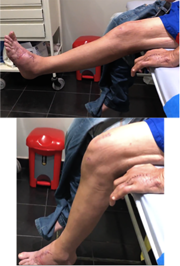 Paciente de sexo masculino de cincuenta y cuatro años, trabajador administrativo, sin antecedentes de relevancia clínica relacionados con la enfermedad. Sufrió un accidente en motocicleta, en el que fue embestido por otra moto. Como consecuencia presentó un traumatismo de cráneo encefálico leve (TEC) sin pérdida de conocimiento, fracturas expuestas del cuarto y quinto metacarpiano en mano izquierda y fracturas múltiples expuestas en pie izquierdo (clasificación de Gustilo II). Además, inestabilidad aguda de rodilla izquierda compatible con lesión multiligamentaria (clasificación de Schenck KD IIIM — lesión aguda del LCA y LCP, lesión completa del LCM).