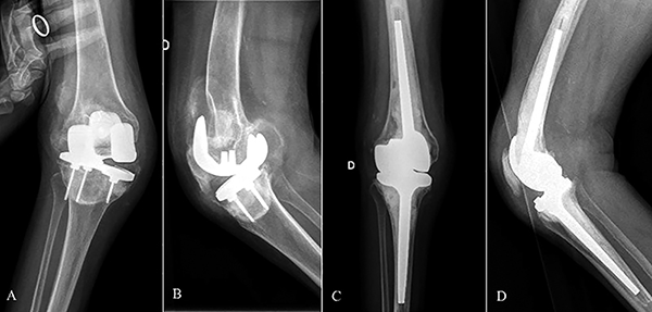 Figura 2: Caso 16. A y B) Paciente de setenta y dos años con un espaciador de cemento en rodilla derecha secundario a una infección protésica previa. C y D) Radiografías de frente y perfil a los tres años de seguimiento de prótesis abisagrada de rodilla Endo-Model.