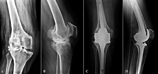 Figura 1: Caso 17. A y B) Paciente de setenta y ocho años con genu valgo severo. C y D) Artroplastia total de rodilla con prótesis abisagrada Endo-Model.