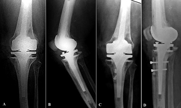 Figura 3: Caso 22. Artroplastia de rodilla derecha a los veintitrés años de seguimiento. A y B) Radiografías frente y perfil donde se observan signos de aflojamiento y de incompetencia del ligamento colateral medial en la radiografía con estrés. C y D) Control radiográfico frente y perfil de implante protésico abisagrado a los veintidós meses de seguimiento.