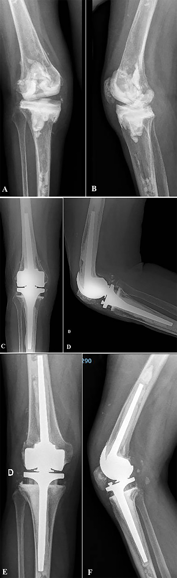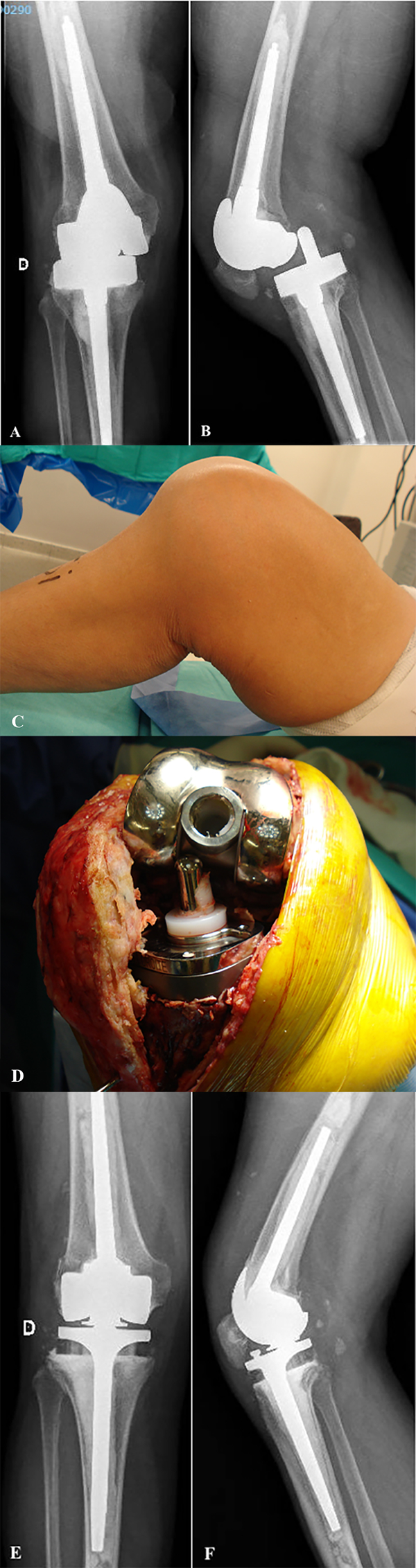 Figura 5: Caso 2. A y B) Paciente de sesenta y siete años con prótesis abisagrada Rotax, FII SA®, Saint-Just-Malmont, Francia. Radiografía de frente y perfil donde se observa una luxación posterior de rodilla. C) Imagen clínica de la luxación protésica. D) Imagen intraoperatoria donde se observa la ruptura del polietileno del componente femoral. E y F) Revisión protésica con prótesis abisagrada Endo-Model, seguimiento a los cinco años.