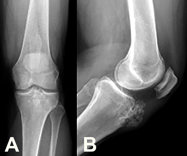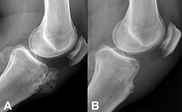 Figura 9: Imagen de radiografía comparativa preoperatoria (a) y a los tres meses postoperatorios (b). Nótese la resección completa de la tumoración preservando la altura rotuliana.