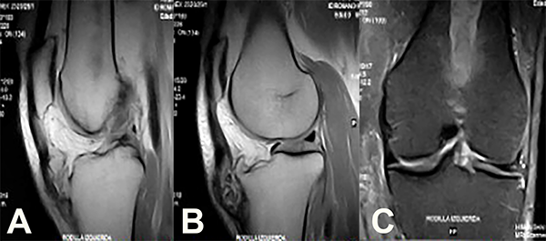 En la resonancia magnética (RM) se pudieron identificar ciertas fibras del TR indemnes, llegando a la inserción distal (fig. 4a) y otras zonas afectadas intrasustancia (fig. 4b). Además, se pudo caracterizar la imagen en el fémur como una displasia fibrosa del fémur distal (fig. 4c).